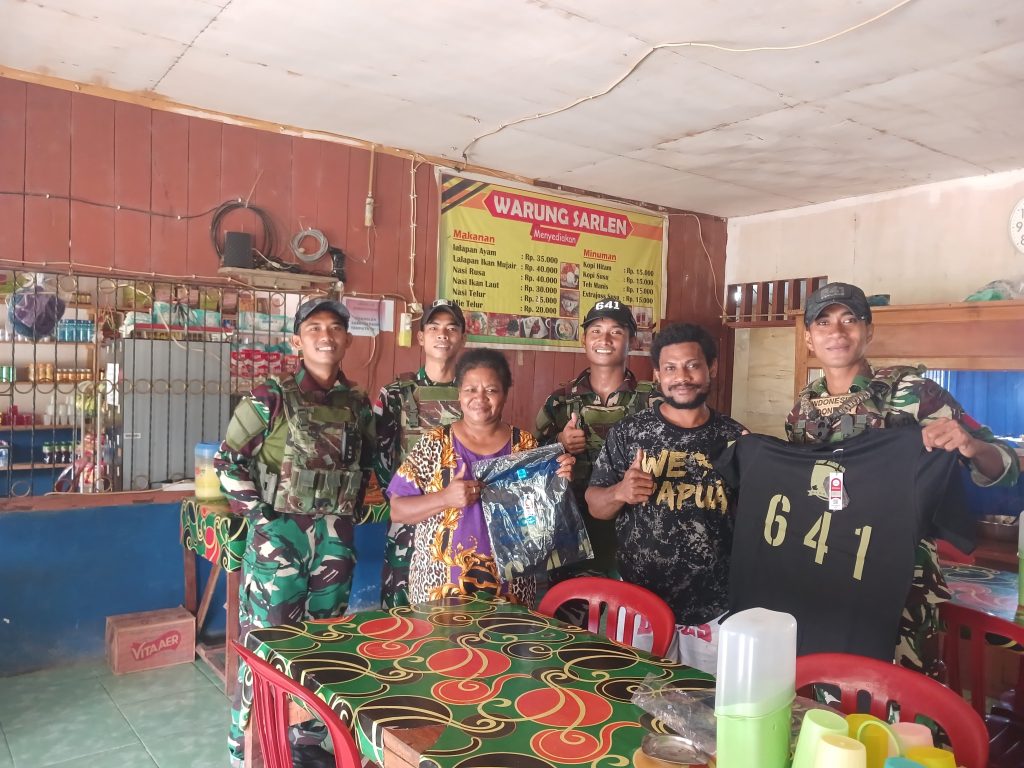 Kegiatan ini merupakan bagian dari upaya Satgas untuk mempererat hubungan antara TNI dan masyarakat di wilayah penugasan. Sebanyak puluhan baju kaos dibagikan kepada warga, Kegiatan berlangsung dengan penuh keakraban dan sukacita.