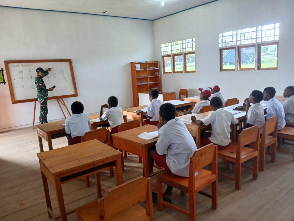 Keberadaan Satgas Yonif 641/Bru di wilayah Papua khususnya Distrik Kobakma terus memberikan dampak positif bagi masyarakat, khususnya di bidang pendidikan. Satgas 641/Bru Pos Kobakma membantu mengajar siswa-siswi SD 01 Saralema, Distrik Kobakma, Kabupaten Membramo Tengah, Provinsi Papua Pegunungan, (14/05/2025).