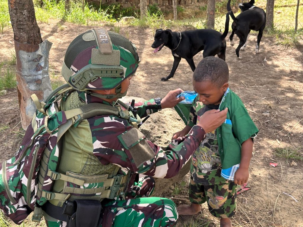 Tak sekadar berkunjung, personel Pos Kotia Walesi juga memberikan baju layak pakai kepada masyarakat setempat, sebagai bentuk kepedulian terhadap kesejahteraan warga.