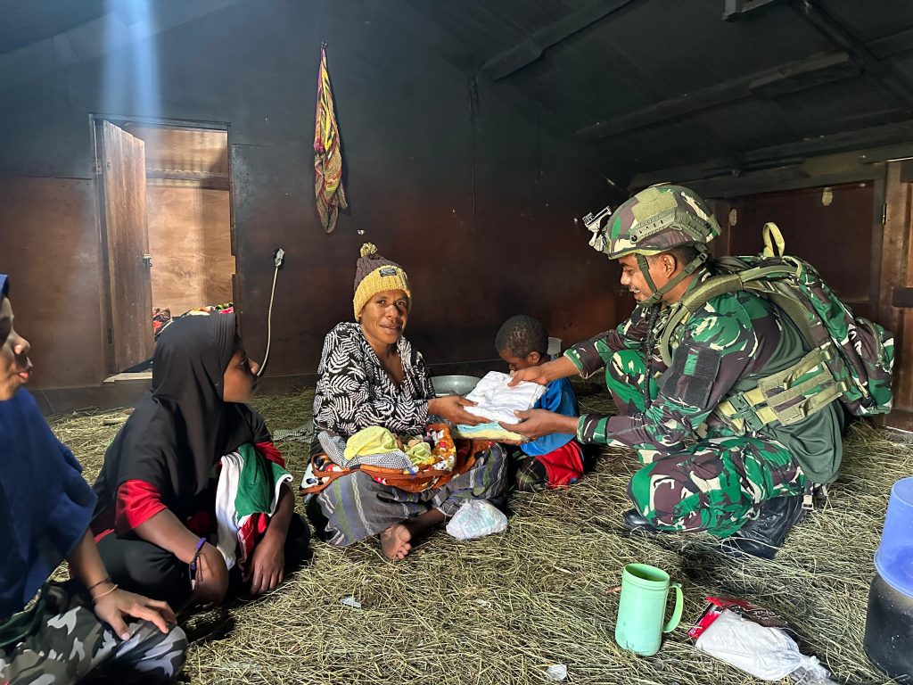 Wamena – Prajurit Satgas Yonif 521/DY Pos Walesi Binter yang berkelanjutan dengan berbagi kasih berupa pembagian pakaian layak pakai, Bibit tanaman, Snack Ringan berupa biskuit, permen kepada warga dan Anak-Anak Kampung Asoyelipele Distrik Walesi, Kab. Jayawijaya.