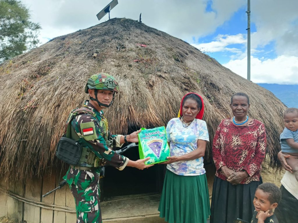 LANNY JAYA – Sebagai wujud kepedulian terhadap masyarakat binaan, Satgas Yonif 614/RJP Pos Popome melaksanakan Anjangsana dan Bagikan sembako ke Honai masyarakat kampung Popome, Distrik Mokoni, Kabupaten Lanny Jaya, Papua Pegunungan, Selasa (17/6/2025).