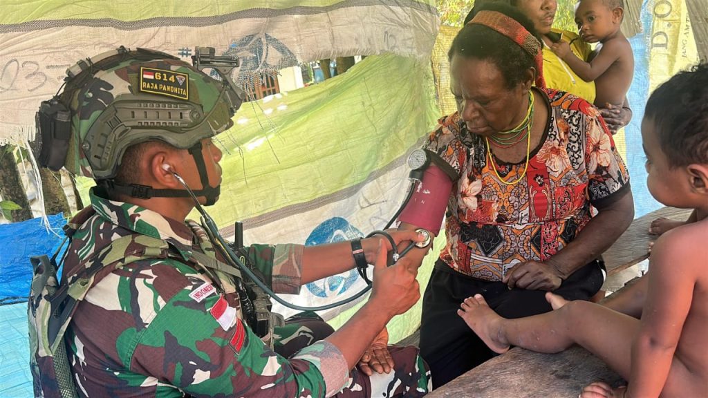 TOLIKARA – Personel Satgas Pamtas RI-PNG Kewilayahan Yonif 614/RJP melaksanakan layanan pengobatan gratis di Desa Ampera, Distrik Karubaga, Kabupaten Tolikara, Papua Pegunungan.