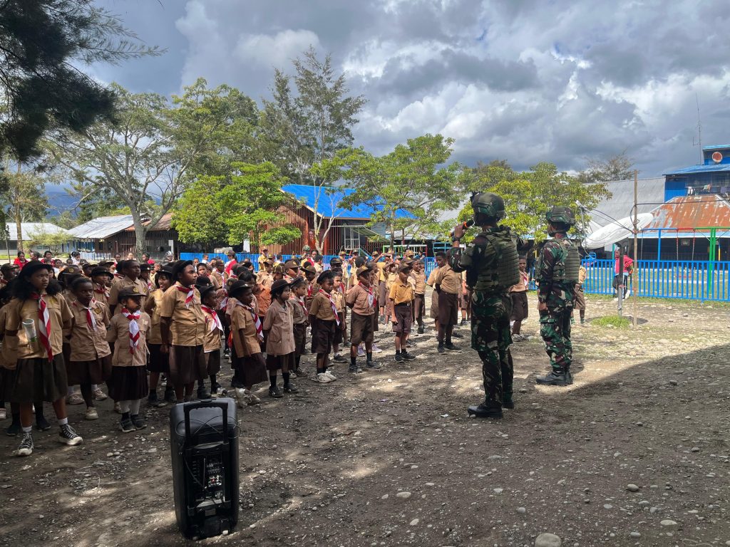 Wamena – Suasana berbeda terlihat di halaman SD Koinonia pagi ini. Anak-anak tampak antusias menyambut kedatangan prajurit TNI Satgas Yonif 521/DY Pos Napua yang hadir untuk memberikan pembelajaran dan motivasi. Kegiatan ini merupakan bagian dari program TNI dalam mendukung pendidikan dan membangun semangat kebangsaan sejak usia dini, Jum’at (29/08/2025).