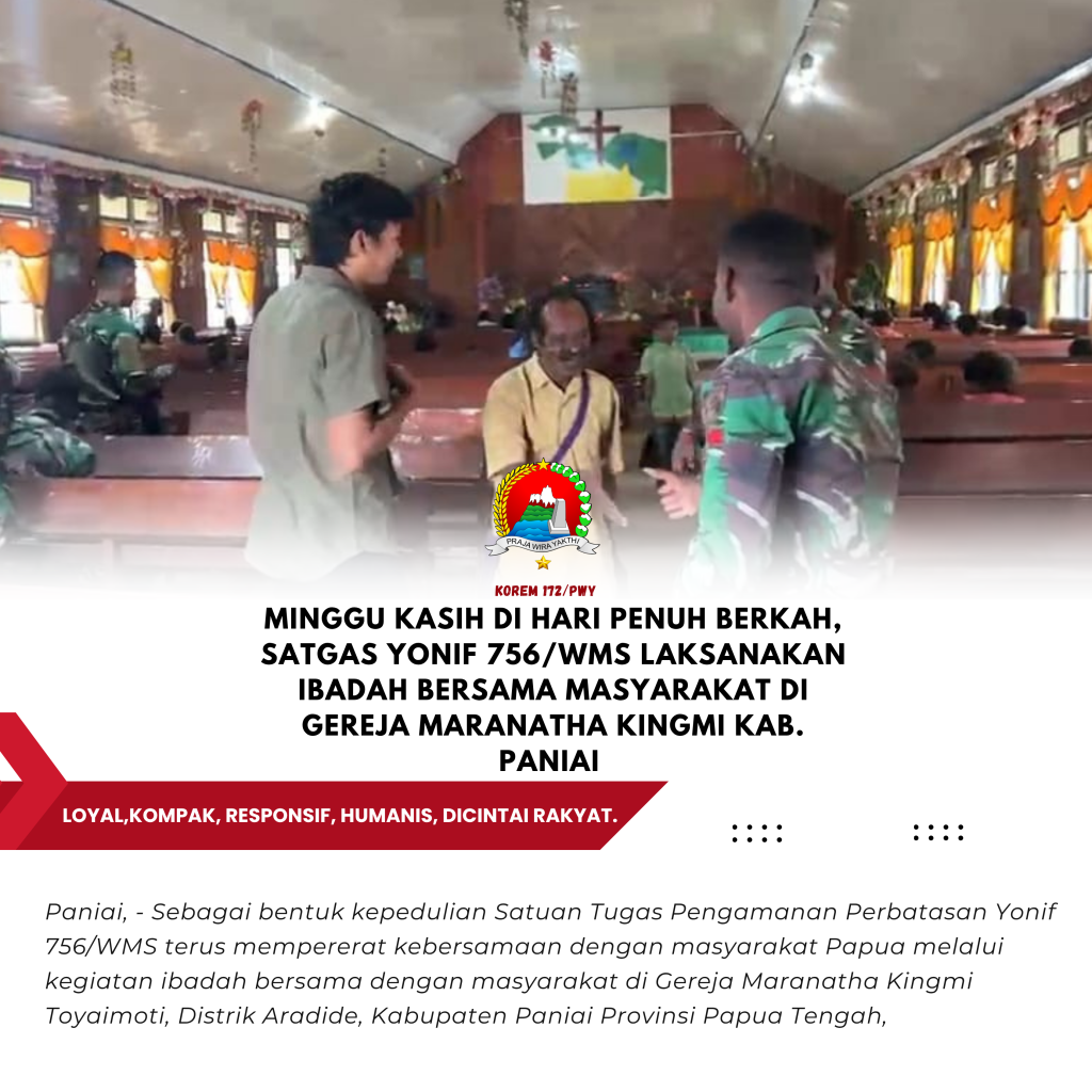 Paniai, – Sebagai bentuk kepedulian Satuan Tugas Pengamanan Perbatasan Yonif 756/WMS terus mempererat kebersamaan dengan masyarakat Papua melalui kegiatan ibadah bersama dengan masyarakat di Gereja Maranatha Kingmi Toyaimoti, Distrik Aradide, Kabupaten Paniai Provinsi Papua Tengah, Minggu (22/06/2025).
