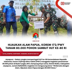 Jayapura – Dalam rangka memperingati HUT ke-80 Kemerdekaan Republik Indonesia, Korem 172/Praja Wira Yakthi (PWY) menggelar kegiatan penanaman 80.000 pohon...