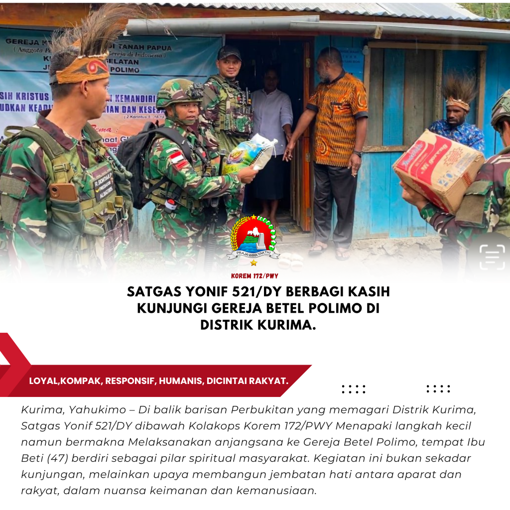 Kurima, Yahukimo – Di balik barisan Perbukitan yang memagari Distrik Kurima, Satgas Yonif 521/DY dibawah Kolakops Korem 172/PWY Menapaki langkah kecil namun bermakna Melaksanakan anjangsana ke Gereja Betel Polimo, tempat Ibu Beti (47) berdiri sebagai pilar spiritual masyarakat. Kegiatan ini bukan sekadar kunjungan, melainkan upaya membangun jembatan hati antara aparat dan rakyat, dalam nuansa keimanan dan kemanusiaan.