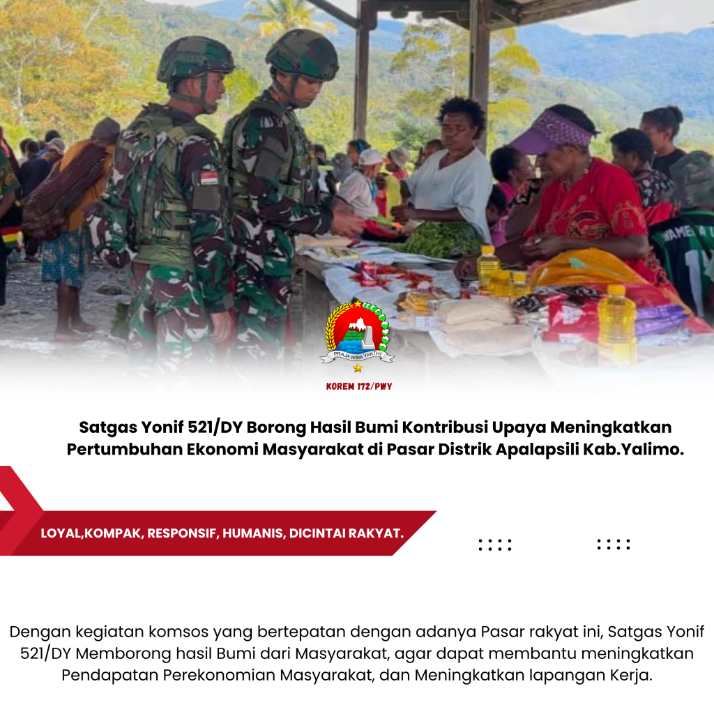 “Kegiatan ini merupakan salah satu kegiatan yang efektif dilakukan dalam berinteraksi secara langsung dengan Masyarakat yang merupakan daerah penugasan yonif 521, Berkaitan Pasar rakyat yang di adakan masyarakat dalam seminggu 2 kali ini merupakan momen sarana yang efektif dilakukan untuk menyerap hasil bumi membantu Masyarakat untuk meningkatkan taraf hidup dan ekonomi Sehingga dirasakan oleh Masyarakat distrik Apalapsili Khususnya