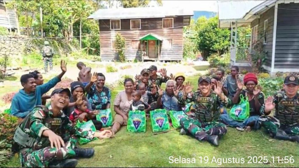 TOLIKARA – Satgas Yonif 614/RJP Pos Kanggime melaksanakan Anjangsana dan bagikan sembako kepada masyarakat di Desa Kanggimaluk, Distrik Kanggime, Kabupaten Tolikara, Papua Pegunungan. Selasa (19/8/2025).
