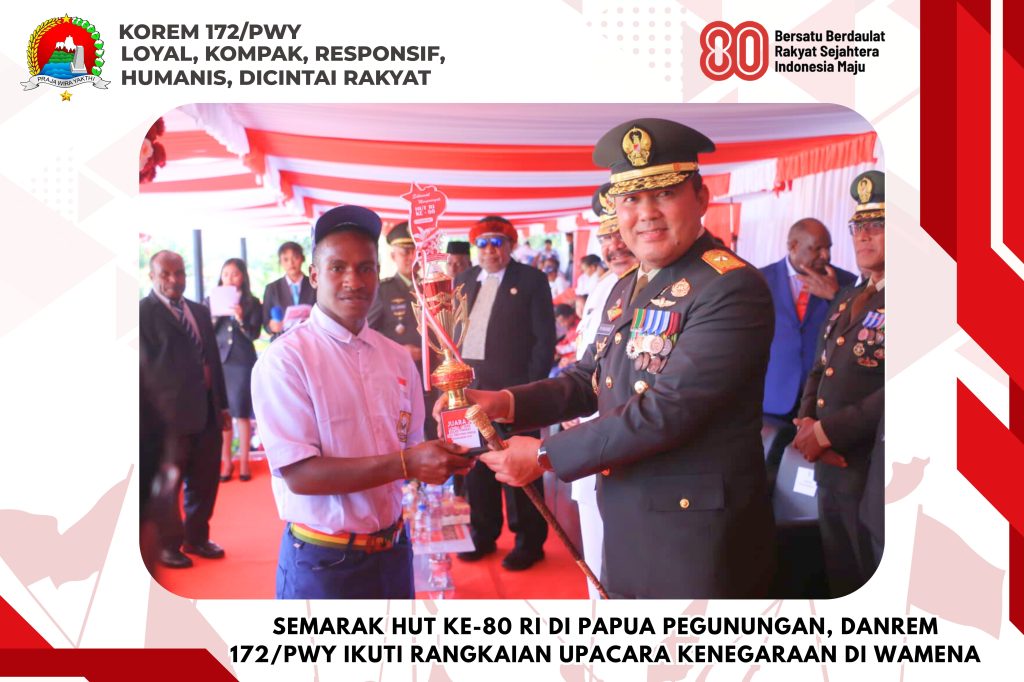 Wamena – Peringatan Hari Ulang Tahun (HUT) ke-80 Kemerdekaan Republik Indonesia di Provinsi Papua Pegunungan berlangsung meriah dan penuh khidmat. Danrem 172/ PWY Brigjen TNI Tagor Rio Pasaribu, S.E., turut serta mengikuti seluruh rangkaian kegiatan yang dipusatkan di Kota Wamena sejak Sabtu (16/8/2025) hingga Minggu (17/8/2025).