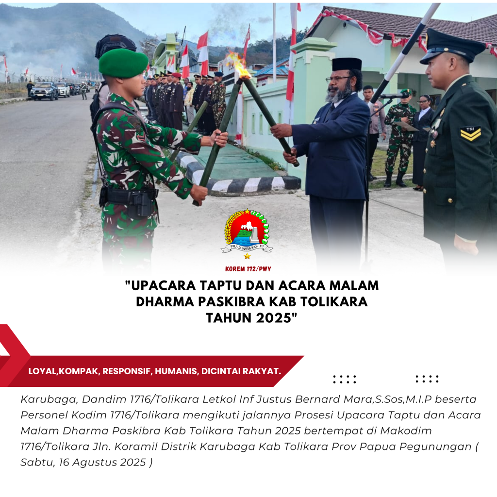 Karubaga, Dandim 1716/Tolikara Letkol Inf Justus Bernard Mara,S.Sos,M.I.P beserta Personel Kodim 1716/Tolikara mengikuti jalannya Prosesi Upacara Taptu dan Acara Malam Dharma Paskibra Kab Tolikara Tahun 2025 bertempat di Makodim 1716/Tolikara Jln. Koramil Distrik Karubaga Kab Tolikara Prov Papua Pegunungan ( Sabtu, 16 Agustus 2025 )