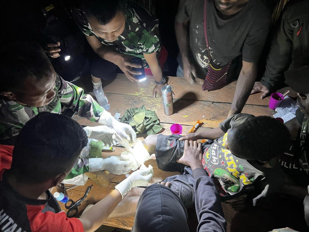 Tanpa menunggu lama, Tim Kesehatan Pos Tima Satgas Yonif 511 Dibyatara Yodha, segera mengambil tindakan. Serka Joko Tri Asmoro dan Prada Vicky Ainun, tenaga kesehatan di Pos tersebut, langsung melakukan pembersihan dan perawatan terhadap luka tersebut.