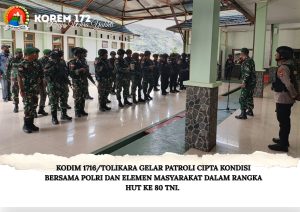 Dalam rangka memperingati Hari Ulang Tahun ke 80 TNI, Kodim 1716/Tolikara bersama dengan Polres Tolikara dan elemen masyarakat melaksanakan patroli...