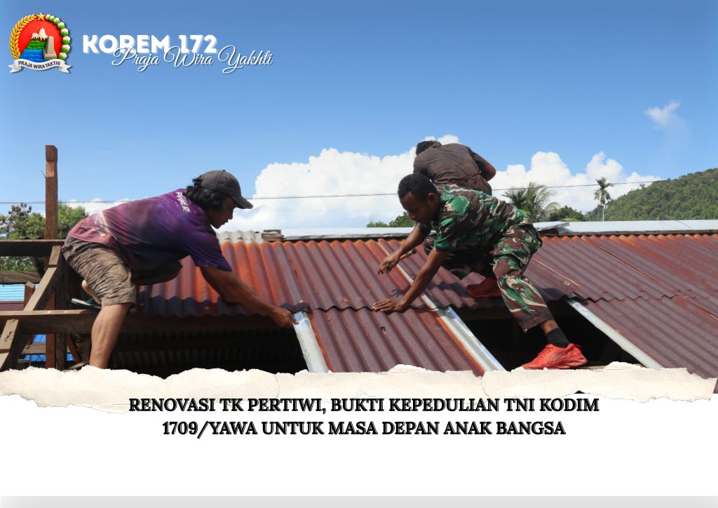 Kabupaten Kepulauan Yapen – Dalam rangka menyambut HUT ke-80 TNI Tahun 2025, Kodim 1709/Yawa melaksanakan Kegiatan Bakti Teritorial Prima berupa renovasi Gedung Sekolah TK Pertiwi yang berlokasi di Jl. St. Rumbewas, Distrik Yapen Selatan, Kabupaten Kepulauan Yapen.Senin(15/9/2025).