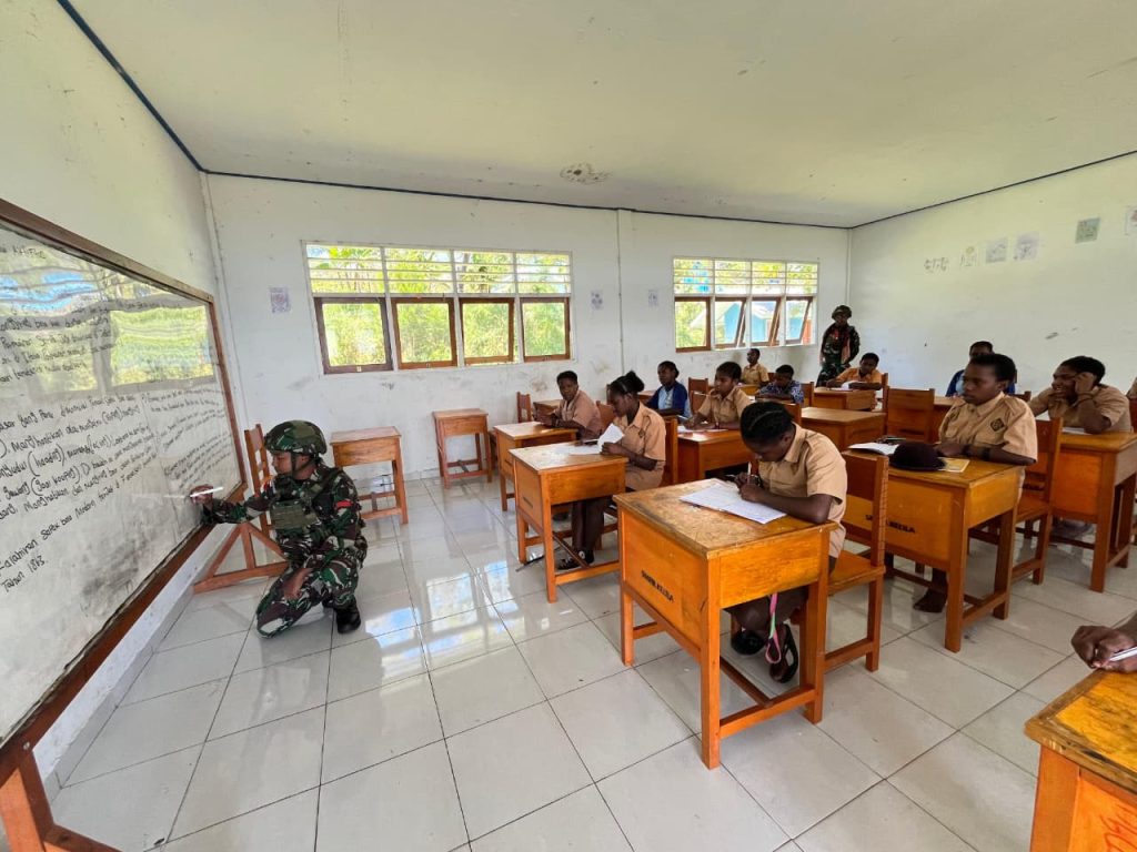 Mamberamo Tengah – Untuk mencerdaskan anak Papua, diperlukan upaya multifaset seperti menyediakan fasilitas belajar yang layak, memberikan bimbingan belajar yang disesuaikan dengan konteks lokal, menanamkan wawasan kebangsaan dan nilai-nilai karakter, Seperti yang dilakukan Satgas TNI Satgas Yonif 521/DY Pos Kelila membantu meningkatkan ilmu pengetahuan kepada murid SMP N Kelila penting untuk meningkatkan kualitas dan akses pendidikan di Papua, Sabtu 04/10/2025.