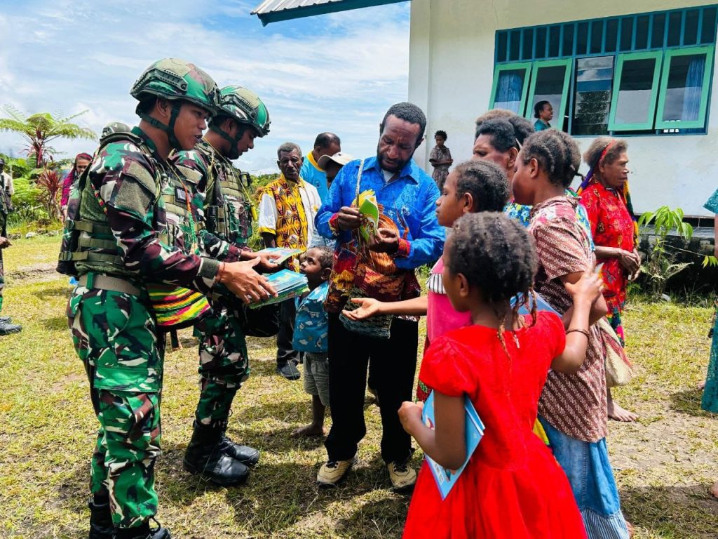 Apalapsili – Dalam rangka mempererat hubungan dengan masyarakat, Satgas Yonif 521/DY melaksanakan kegiatan Komunikasi Sosial (Komsos) dengan membagikan buku cerita kepada anak-anak serta Alkitab kepada masyarakat di Distrik Apalapsili, Kabupaten Yalimo, Provinsi Papua Pegunungan, Minggu (22/02/2026).