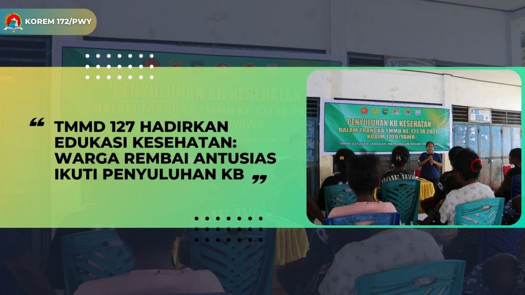YAPEN – Kepedulian terhadap kesehatan masyarakat terus diwujudkan melalui program non fisik TNI Manunggal Membangun Desa (TMMD) ke-127 Kodim 1709/Yawa. Bertempat di Balai Kampung Rembai, Distrik Wonawa, Kabupaten Kepulauan Yapen, dilaksanakan kegiatan penyuluhan Keluarga Berencana (KB) dan kesehatan bagi masyarakat setempat.Pada Senin(23/2/2026).