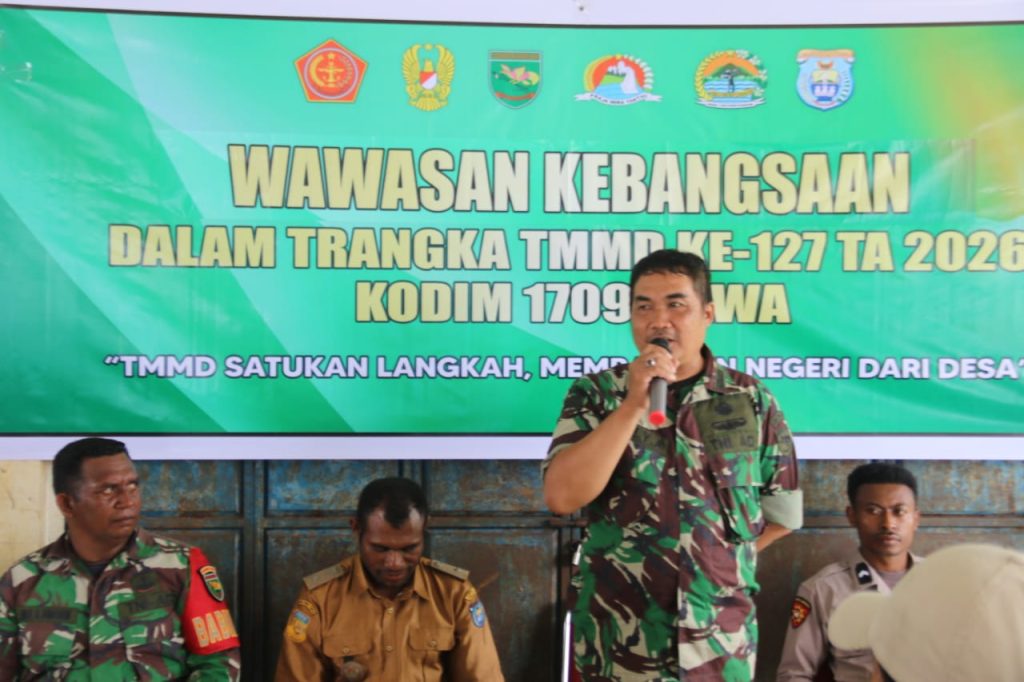 Yapen – Dalam rangka mendukung program non fisik TNI Manunggal Membangun Desa (TMMD) ke-127, Kodim 1709/Yawa melaksanakan kegiatan penyuluhan Wawasan Kebangsaan (Wasbang) yang berlangsung di Pasar Kampung Rembai, Distrik Wonawa, Kabupaten Kepulauan Yapen.Selasa(17/02/2026).