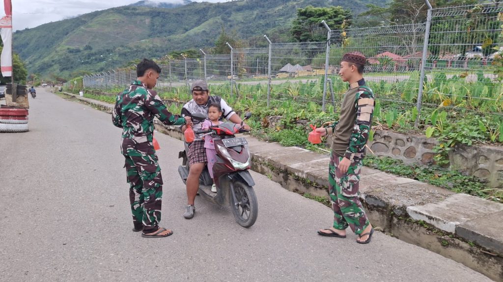 TOLIKARA – Anggota Satgas Pamtas Yonif 511/DY Badak Hitam Pos Kout Karubaga membagikan takjil kepada warga pengguna jalan yang melintas di depan Pos Kout Karubaga, Distrik Karubaga, Kabupaten Tolikara, Senin sore (02/03/2026).
