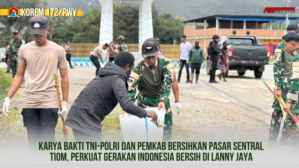Dalam rangka Atensi Pelaksanaan Gerakan Indonesia Bersih, pemerintah Daerah Lanny Jaya bersinergi dengan Polresta Lanny Jaya, Kodim 1713/Lanny Jaya dan Satgas Yonif 511/DY, aparat distrik, serta relawan pasar bekerja sejak pagi mengangkat sampah domestik, menormalkan drainase yang tersumbat. Kab. Lanny Jaya, Distrik Tiom. Kamis 02/04/2026.