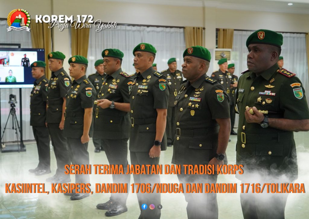 Abepura, 27 April 2026 — Komandan Korem 172/Praja Wira Yakthi, Brigjen TNI Robby Suryadi, S.Sos., M.M., memimpin langsung acara Serah Terima Jabatan (Sertijab) dan Tradisi Korps Kasiintel, Kasipers, Dandim 1706/Nduga, dan Dandim 1716/Tolikara yang dilaksanakan di Aula Praja Wira Yakthi, Senin (27/04/2026).