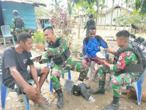 Kebersamaan dan keakraban anggota Pos Wambes Satgas Pamtas RI-PNG Yonif 711/Rks Brigif 22/OM membagikan makanan, sekaligus makan bersama dengan warga...
