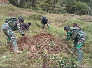 Prajurit Satgas Yonif Raider 321/GT/13/1 Kostrad dari Pos Dal bersama dengan warga mengolah lahan perkebunan yang akan ditanami umbi-umbian serta...