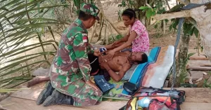 Dengan Sigap Tim Kesehatan Satgas Pamtas RI-PNG Yonif 126/KC Pos Somografi memberikan pelayanan kesehatan kepada Alex Full (44) masyarakat Kampung...