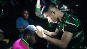 Tim kesehatan Satgas Pamtas RI-PNG Yonif 711/Rks Brigif 22/OM di Pos Pitewi dengan cepat mengobati Warga yang terluka terkena balok...
