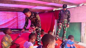 TOLIKARA - Prajurit Satgas Pamtas RI - PNG Kewilayahann Yonif 614/Raja Pandhita Pos Kanggime membantu pemerintah dalam memajukan pendidikan di...