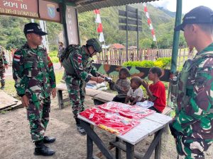 Berbagi kebahagiaan dan buat senyum ceria anak-anak papua, Satgas Yonif 641/Beruang membagikan baju baru kepada anak anak diwilayah Distrik Kurima,...